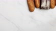Successive stop-motion appearance of different types of bread on white marble background. Wheat bread, rye bread, corn bread, ciabatta, loaf, baguette, bun, brioche on brown wooden table. Stop-motion animation from right to the left