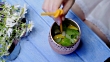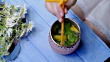Cold refreshing drink of lemon and mint in copper mug on blue table corner. Sunglasses and daisy flowers next to mug. Girl or woman sitting at the table mixing the drink. Top view. Close up