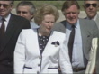 EEC summit in Madrid; SPAIN: Madrid Airport:EXTLA PM Margaret Thatcher followed by For Sec Sir Geoffrey Howe out plane and down steps R-L - Thatcher dressed in blue & white polka dot dress & white jacketCMS Thatcher towards talking to aides PULL OUTEXTTMS Dassault-Breguet Falcon 50 (EEC Commission Presdt Jacques Delors on board) taxis towards and R-LEXTCMS DelorsMadrid:MS Anti bullfight demonstrators towards with banner 'contra la crueldad'AV Placard bull speared and bleeding carried L-RLA Banner towards L-R calling for abolition of bullfightingCMS SIDE Demonstrator in skeleton maskMS Demonstrators in street theatre enact chopping off of bull's headTX:25.6.89/6.30pm