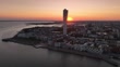 Aerial view of Västra Hamnen in Malmö on a summer morning as the sun rises.