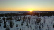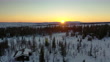 Flying over cabins in Trysil Kunts Fjellverden towards the sunset