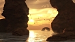 beautiful scene of a sunset on a lake with flock of birds zooming towards the sun