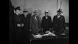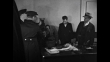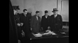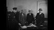 Suspects in attempted kidnapping case Edward McNard, John Collins, Joseph Borg stand by as Lt. Amos Anderson displays evidence on desk in front or them; police officers stand by; the three men are suspects in the attempted kidnapping of Robert Lewis Westheim; they remove their hats; SOT Anderson, whose hat remains on, displays evidence / CU one of the suspects / Note: exact day not known