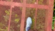 This clip features the view while walking across a suspension bridge in a Costa Rican rainforest. The metal grating is prominent. It allows visitors to experience the unique biodiversity and panoramic views from above the forest floor, offering a unique perspective on exotic flora, fauna, and the misty cloud forest environment.
