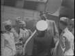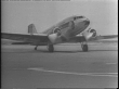 Swedish distance runner Gunder Hagg appears in war relief benefit races / Hagg arrives via Eastern Airlines transport plane, taxies in / Hagg steps off airplane, waves and shakes hands with US runner Gregory Rice / Hagg speaks to Rice in Swedish.