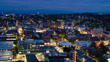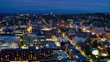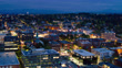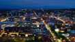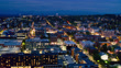 Aerial establishing shot of Burlington, Vermont at night, looking east along busy streets and illuminated buildings towards the hazy shapes of the Green Mountains in the distance. Authorization was obtained from the FAA for this operation in restricted airspace.