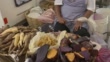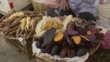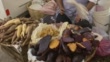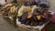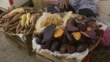 In this shot we see some sweet potatoes root being sold in a popular market in Oaxaca city in the state of Oaxaca in Mexico, this is a street vendor and with her some vegetables in baskets.