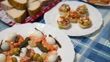 View from above. Pan. First courses of quail eggs, prawns and anchovy, jam, tarts, etc