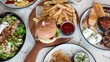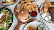 Tabletop spread of burger and fries with assorted dishes. - 4K stock video