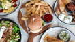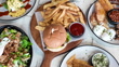 Tabletop filled with a juicy burger beside a pile of golden fries, surrounded by an inviting spread of assorted dishes, crispy appetizers creating a hearty, mouthwatering feast.