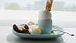 CU Taking top off boiled egg in eggcup and dipping toast in yolk. - 4K stock video