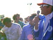 PAUL NEWMAN talking, smiling with entertainer and fellow motor sports enthusiast DICK SMOTHERS of Smothers Brothers fame in pits of Ontario Motor Speedway / sweaty Paul Newman and Dick Smothers wear white racing suits; several cameramen takes pictures / Dick Smothers talking with racing partner, professional race car driver BOBBY UNSER in winner's circle; Bobby Unser smiles, laughs, chews gum / sweaty television broadcaster HUGH DOWNS wearing white racing suit, standing near announcer in winner's circle. OMS Celebrity Pro-Am on August 09, 1970 in Ontario, California (Footage by Getty Images)