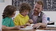 An elementary teacher examines two students' workbooks at their desk.