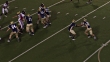 HA WS Teams lining up on line of scrimmage, running play for short gain near thirty yard line, blue end zone w/ letters 'N' & 'S' on left, unidentifiable fans along sidelines, high snap & running play, red/white & blue/gold uniforms w/ numbers.