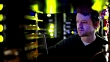 Technician working in server room. He looks up and smiles at camera. MS, slow motion.