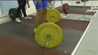 Teenager Zoe Smith in training; ENGLAND: Greater London: Erith: Europa Club:INTVarious shots Zoe Smith (Fourteen year old weightlifter) training in gym, practicing technique with unweighted barbell / Various shots Smith gripping weighted barbell, lifting to shoulders and dropping to ground / Close up weight fixed to barbell / Weights on stand / More of Smith training with weights / Smith performing squats with unweighted barbell