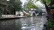 A time lapse view of a barge full of tourists moving past ducks on the San Antonio River.