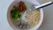 A bowl of congee or porridge with boiled rice in tasty broth with mince pork, egg, fried noodles and spring onion. Congee in Thailand often deviate from the cantonese version served for breakfast.