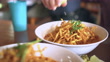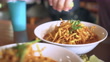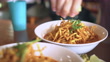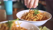 Thai woman's hand seasoning Khao Soi with sour flavor by Squeeze lemon, Curried Noodle Soup with Chicken. Curried noodles soup surrounded by fresh onion and lime. - 4K stock video