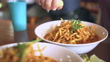 Thai woman's hand seasoning Khao Soi with sour flavor by Squeeze lemon, Curried Noodle Soup with Chicken. Curried noodles soup surrounded by fresh onion and lime.