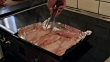 Close up of Bacon cooking. You can see a mans hand as he turns over the rashers of pork to cook in the tray. The meat is on kitchen foil.