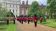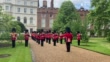 LONDON, ENGLAND - JULY 6: ***PLEASE CREDIT CLARENCE HOUSE AND SEEK PERMISSION/DECLARE USE OF MUSIC TO THE COPYRIGHT HOLDERS.*** The Band of the Coldstream Guards play "Three Lions" and "Sweet Caroline" in the gardens of Clarence House ahead of England's Euro 2020 semi-final game against Denmark on July 6, 2021 in in London, England. In support to the England Football Team as they approach their Semi-Final match in the UEFA Euro Championships on Wednesday evening, The Prince of Wales and The Duchess of Cornwall invited the Band of the Coldstream Guards into the Clarence House Garden to play the following pieces: "Three Lions" – Composed by Ian Broudie, arranged by Oliver Jeans and "Sweet Caroline" – Composed by Neil Diamond, arranged by Tim Waters. (Footage by WPA Pool)