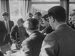 The Beatles arrive in Salzburg; AUSTRIA: Salzburg:EXTMS Ringo Starr, Paul McCartney and George Harrison (The Beatles) off plane MS Fans wait CMS Ringo, John Lennon and George on steps CMS Beatle type fan MS Crowd - pan to hotel INTMS Ringo, John, George and Paul at table with Eleanor Bron and Brian EpsteinCU Paul CU George smokesEXTMS Girls hold Beatles banner - zoom in to one girlINTMS Photographers pan to table CS Beatles at table pan to Ringo Pos 16mm Etes 38 secs 24 ft