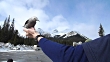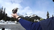 A Clark's Nutcracker lands and feeds off the hand of a man. Mountains and blue skies in the background.
