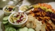The Camera Pans Around Various Dips, Appetizers, Fruits, Cucumbers, Beet Crisps, Crackers, and Hummuses in Bowls on a Cutting Board on a Table at an Indoor Celebration/Party