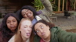 A handheld, medium, selfie shot of a group of female friends spending the day together outdoors in Northumberland, North East England. They are looking at the camera and pulling funny faces.Images also available for this scenario.