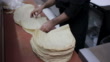 The chef in the kitchen folds and stacks the lavash, Chief baker in a bakery stacks hot baked pita bread in piles in many layers. Armenian lavash baking process, Pita Bread, Arabian Bread, Syrian Bread, Arab Khubz, Indian Flat Bread in Tandoor - 4K stock video