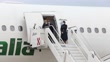 ROME, ITALY - MARCH 05: The crew of the Papal Flight to Iraq wait for Pope Francis arrives at the Leonardo Da Vinci airport on March 05, 2021, in Rome, Italy. Pope Francis will start the historic first-ever papal visit to Iraq. In his first foreign trip since the start of the pandemic, Pope Francis will visit Baghdad, Najaf, Erbil and the cities of Qaraqofor the arrival and Mosul, which were heavily destroyed by ISIS. Although the trip is seen as an act of solidarity, the Vatican has been forced to defend the decision to go ahead with the papal visit amid the ongoing coronavirus pandemic, as Iraq is currently seeing a spike in infection rates as it faces a deadly second wave of the virus. (Footage by Franco Origlia/Getty Images)