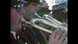 The four Beatles in traditional brass band uniforms playing trumpets, goofing around and making faces /