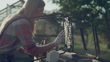The girl is renovating an old chair in the garden. Starches putty on rust. DIY project. - 4K stock video