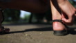 The girl rubbed the callus after putting on new leather shoes. Big wet corn on the heel feet