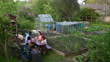 A static, wide shot of a family sitting on a picnic table in their allotment surrounded by homegrown produce. They are talking while looking at plants they are about to plant in pots. Their family dog is running around in the background.