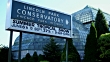 Exterior shot of the sign outside the main entrance of the Lincoln Park Conservatory / The Victorian Era glass house that was built in the late 19th century stands behind the sign