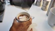 The professional of a barista poured stream milk. making hot chocolate latte art with equipment, tool brewing on the bar at kitchen home