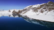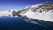The snow-covered valley meets the calm reflective waters of Tilicho Lake. - 4K stock video