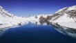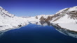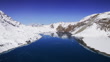 The snowy shoreline of Tilicho Lake curves gently into the icy blue basin. - 4K stock video