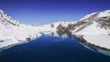 A peaceful winter lake glows at the base of rugged Himalayan cliffs.
