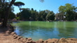 Idyllic summer video of the Temple of Aesculapius (Tempio di Esculapio) in Villa Borghese, Rome. Visitors enjoy rowing boats across the calm green lake, surrounded by tall trees and lush nature. The neoclassical temple and the shimmering water create a peaceful, romantic, and timeless atmosphere. Ideal for conveying leisure, travel, Italian charm, or moments of relaxation and connection with nature.