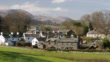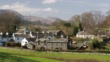 The village of Near Sawrey looking towards Bow Fell in Langdale, Lake District, UK.