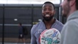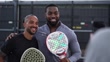 LONDON, ENGLAND - SEPTEMBER 27: Theo Walcott (L) and Lutalo Muhammad pose together on the court during the "Pro Am Padel Tour" photocall at Rocket Padel at Battersea Power station on September 27, 2024 in London, England. (Footage by David Sampedro/Getty Images)