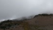 A static, wide-angle shot reveals a desolate mountain slope partially shrouded in a thick, low-hanging blanket of mist. The landscape features a mix of loose gray rocks and patches of golden-brown autumn tundra, with dark evergreen silhouettes clinging to the distant ridges. Soft, flat light from the heavy overcast sky emphasizes the quiet, somber mood of the high-altitude wilderness. This scene captures the ethereal beauty of the Pacific Northwest along the Mount Fremont Trail. It is ideal for cinematic travel films, meditation backgrounds, or environmental documentaries exploring the isolation of mountain peaks.