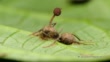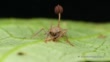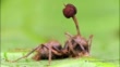 This carpenter ant from the Amazon rainforest of Ecuador became infected with a fungus that forces the ant to climb up and bite down on the underside of a leaf. Then it slowly decomposes the ant and grows a spore-releasing stalk from its head in order to infect more ants. Such Entomopathogenic Fungi attack many other insects and may be employed as biological insecticides. Crazy!