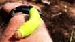 Gigantic green caterpillar is allowed to crawl on man's arm