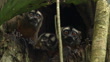 Three owl monkeys look at camera from tree trunk hollow, Peru. - HD stock video