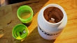Three Shots of Man's Hand with Chocolate Whey Protein and Green Plastic Shaker Bottle