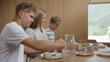 Three teenagers share a breakfast with fresh vegetables and grapefruit juice - 4K stock video